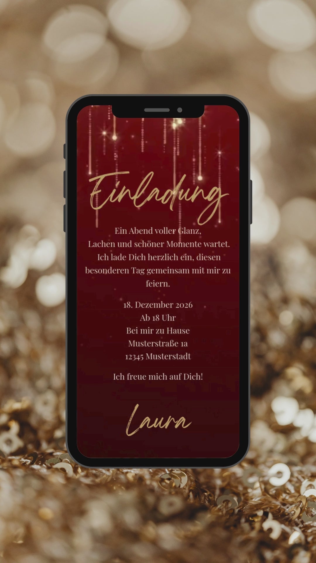 Digitale Geburtstags-Videoeinladung – Goldene Lichtstreifen & edles Rot