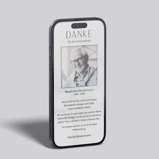 Eine stilvolle digitale Danksagung, die Erinnerung und Wertschätzung in einem modernen, ruhigen Design verbindet.