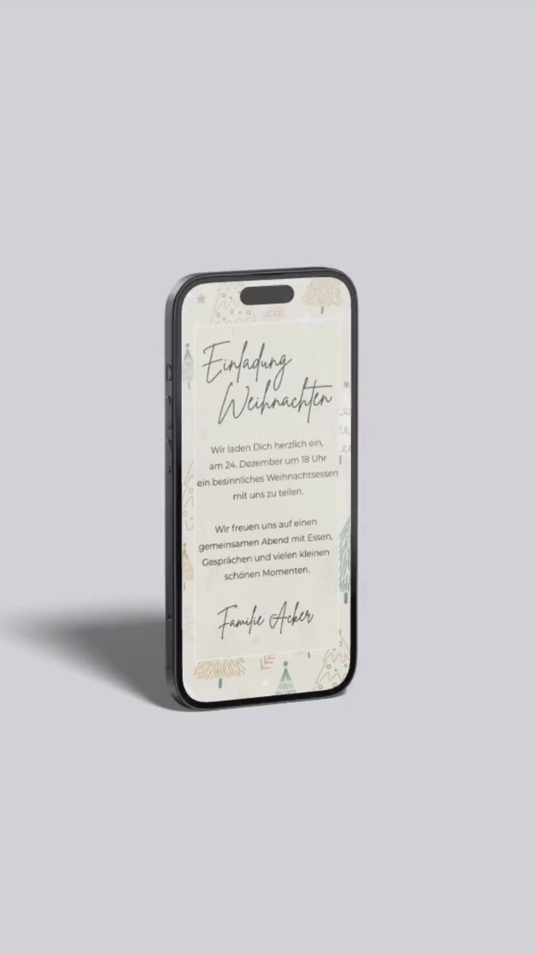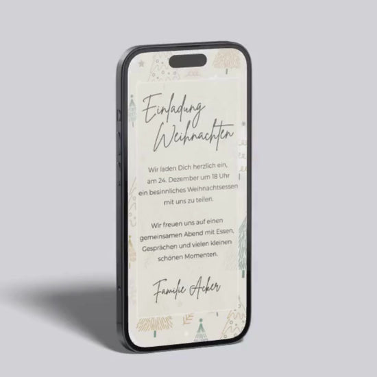 Diese digitale Weihnachtseinladung bringt mit ihren zarten Farben und den verspielten Illustrationen eine fröhliche, warme Winterstimmung aufs Smartphone. Die kleinen Tannen, Sterne und Linien in Grün- und Goldtönen wirken leicht, modern und liebevoll – ideal für alle, die eine freundliche, festliche Einladung mit einem frischen Look suchen.