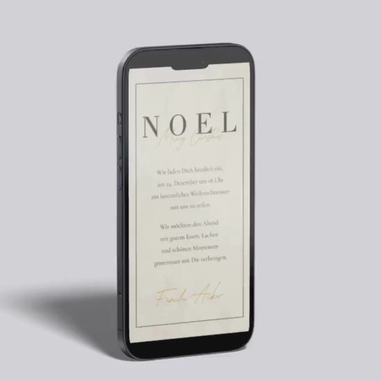 Diese digitale Weihnachtseinladung besticht durch ihre elegante Schlichtheit und den modernen, klaren Aufbau. Der große „NOEL“-Schriftzug wirkt zeitlos und stilvoll, während die zarte goldene Handschrift „Merry Christmas“ einen warmen, festlichen Akzent setzt. Das dezente Papierstruktur-Design im Hintergrund verleiht der Karte Tiefe und eine hochwertige, ruhige Anmutung.