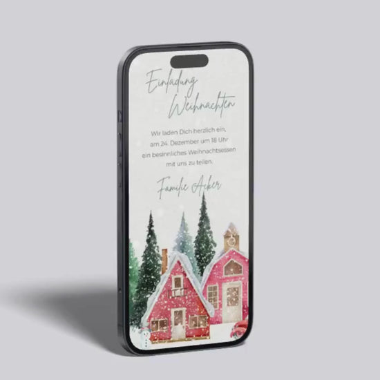 Digitale Einladung zu Weihnachten – winterliches Aquarelldesign mit gemütlichen Häuschen