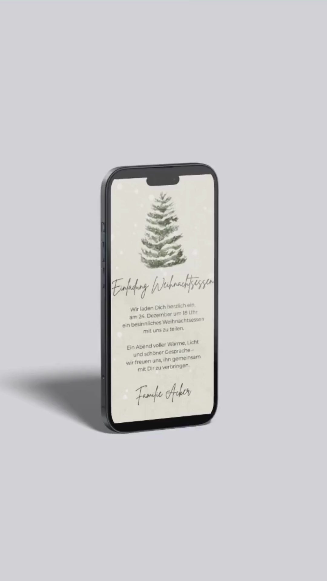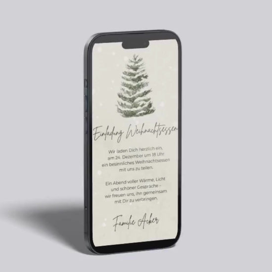Diese liebevoll gestaltete digitale Einladung mit winterlichem Tannenbaum und sanftem Schneefall ist perfekt, um Familie und Freunde stilvoll zum Weihnachtsessen einzuladen. Die schlichte Eleganz auf beigefarbenem Hintergrund vermittelt Wärme, Besinnlichkeit und festliche Vorfreude – ideal für ein gemeinsames Abendessen am 24. Dezember oder an den Feiertagen.