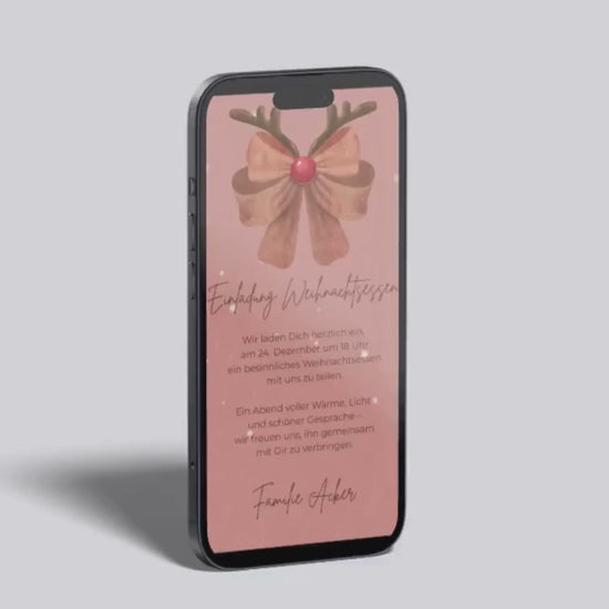 Diese festliche Einladung zum Weihnachtsessen bringt sofort gemütliche Stimmung auf jedes Handy. Das Design kombiniert eine sanfte roséfarbene Hintergrundstruktur mit einer stilvollen Schleife im Rentier-Look – perfekt für alle, die die Adventszeit gerne modern, freundlich und dennoch traditionell feiern.