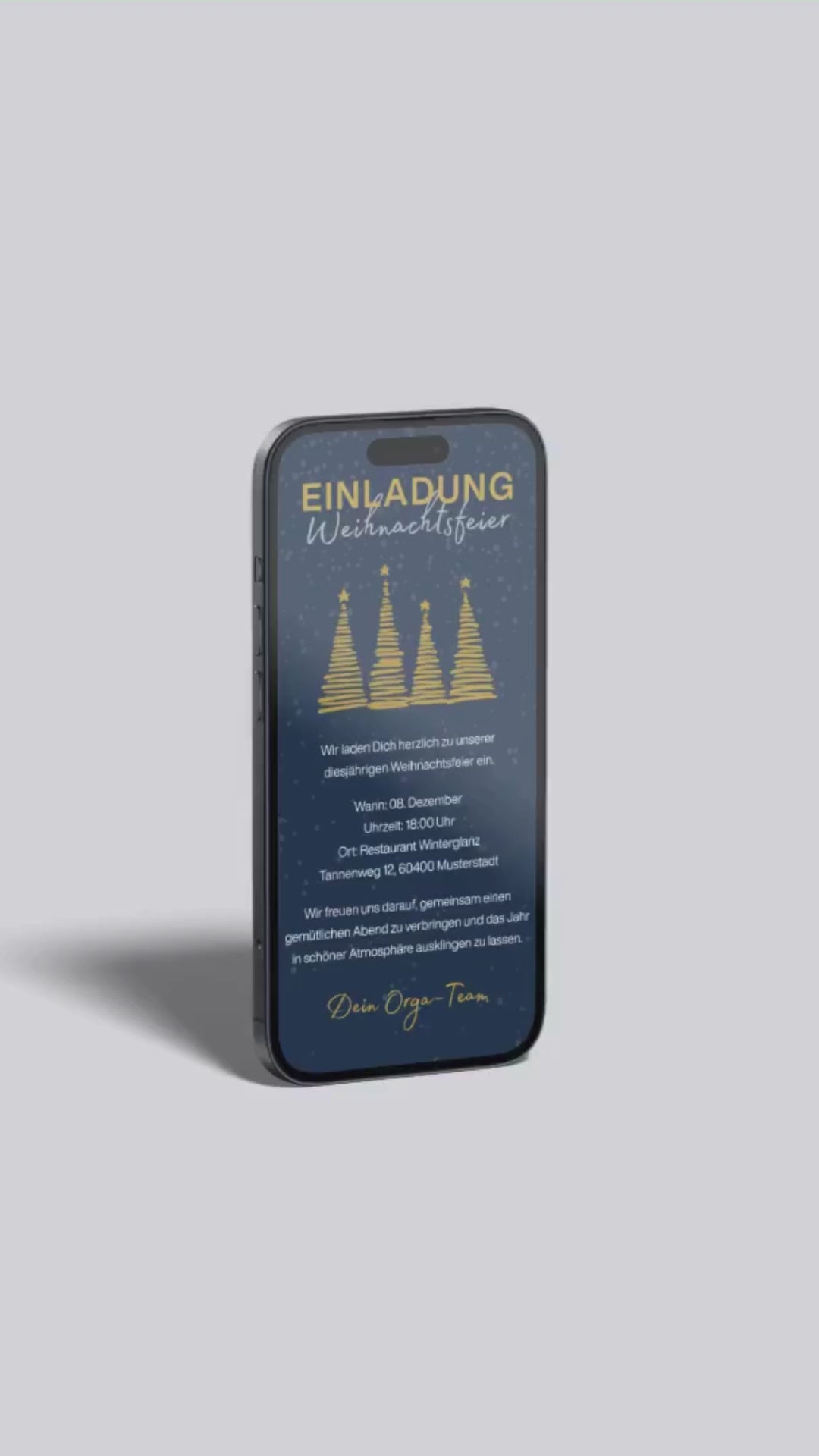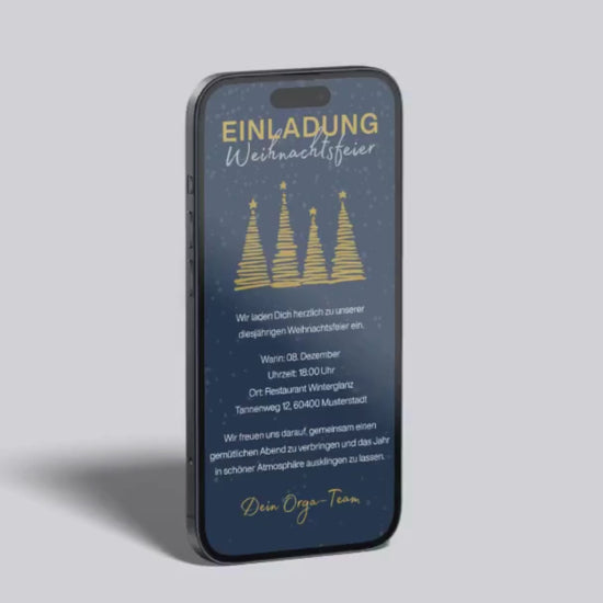 Diese digitale Einladung zur Weihnachtsfeier überzeugt mit einem eleganten Design in Dunkelblau und Gold. Die stilisierten Tannenbäume bringen festliche Stimmung auf dein Smartphone und laden auf moderne und stimmungsvolle Weise zur Feier ein.