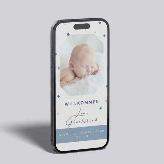 Diese digitale Geburtskarte begrüßt ein neues kleines Wunder mit einem warmen, liebevollen Design und zarten Sternenmotiven. Die Karte wird individuell mit dem Foto des Babys, dem Namen, allen Geburtsdaten und deinem gewünschten Text personalisiert – so entsteht ein ganz persönlicher Willkommensgruß, der Familie und Freund*innen auf besonders schöne Weise erreicht.