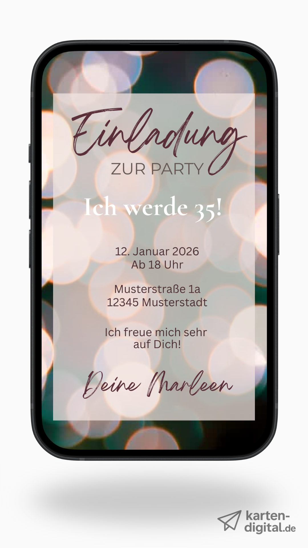 Die harmonische Kombination aus dezenten Farben, feiner Typografie und den sanft animierten Lichtkreisen schafft eine besondere Stimmung – ideal für eine stilvolle Geburtstagsfeier mit persönlicher Note. Das Design wirkt modern, ruhig und hochwertig zugleich.