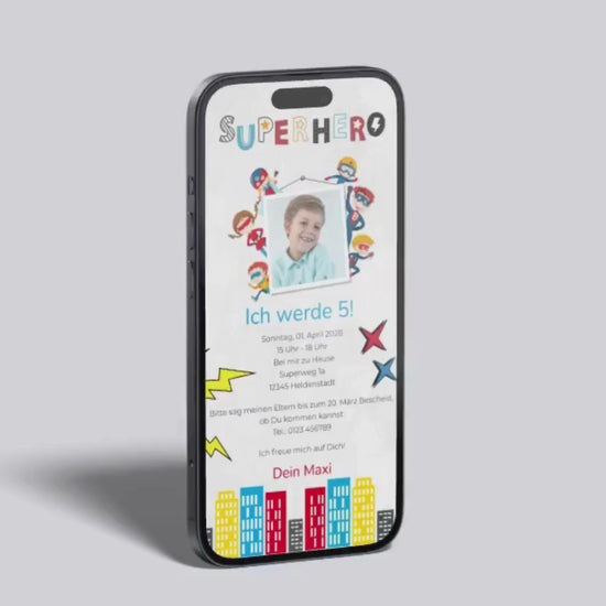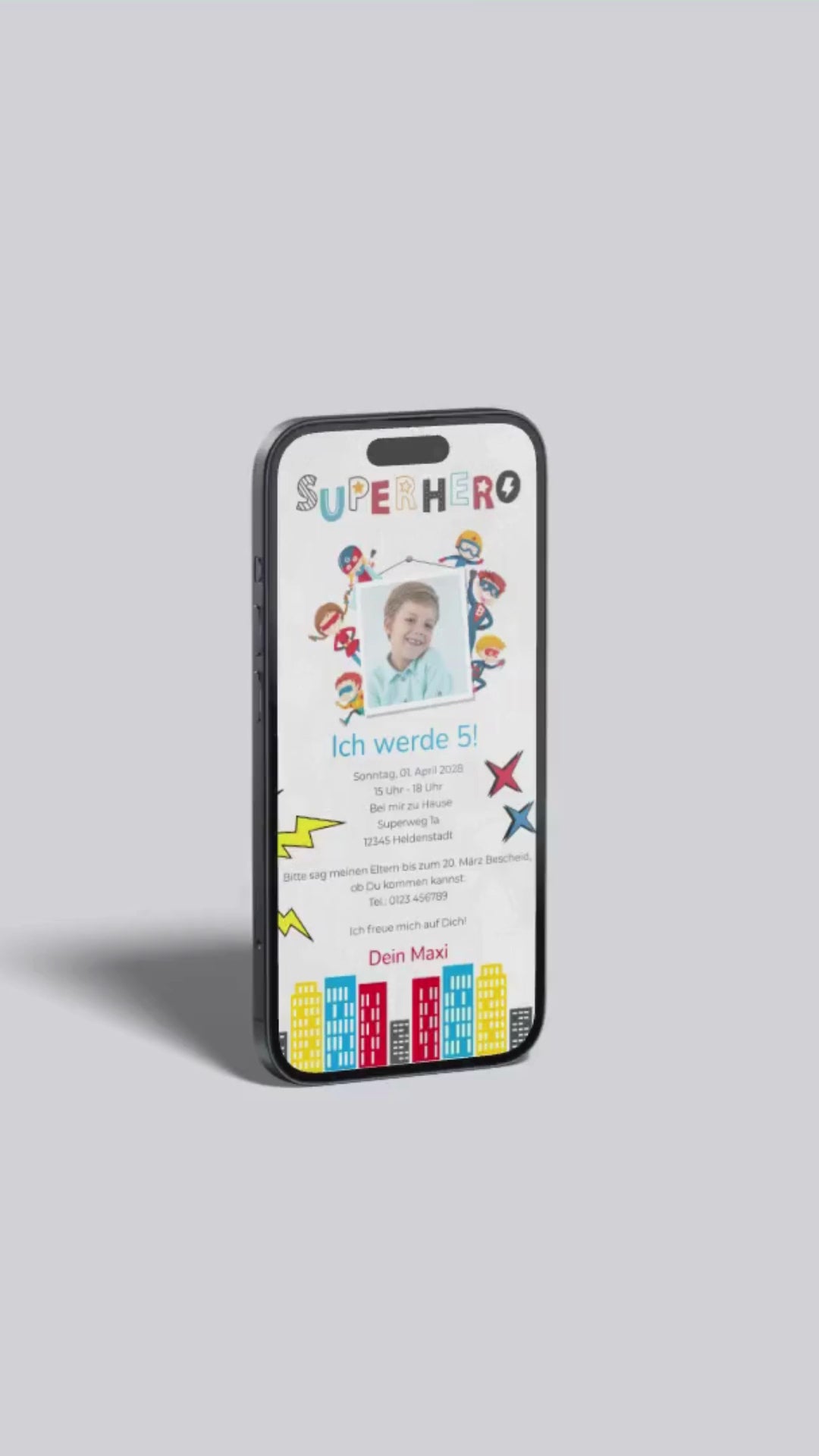 Diese digitale Geburtstagseinladung voller bunter Superheld*innen bringt sofort Freude und Energie auf jedes Smartphone. Die verspielten Illustrationen, kombiniert mit lebhaften Farben und fröhlichen Details, machen sie zur perfekten Wahl für kleine Heldinnen und Helden, die ihren besonderen Tag feiern möchten.