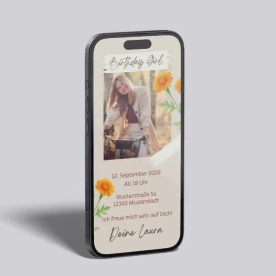 Digitale Geburtstagseinladung im Boho-Stil – mit Foto & Blumenmotiv