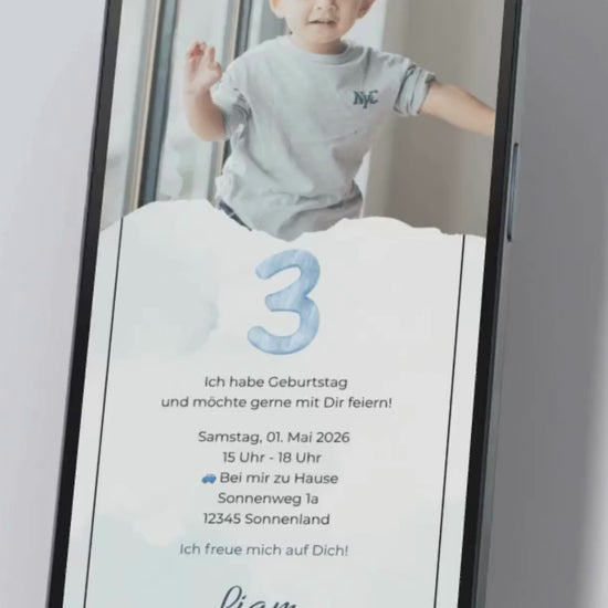 Digitale Geburtstagseinladung für Kinder – schlichtes Design in Blau mit Foto