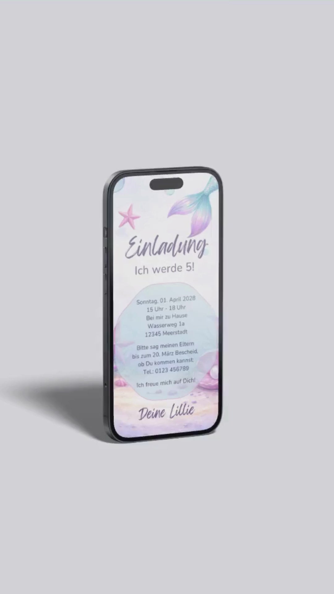 Alle Inhalte können frei personalisiert werden – Name, Alter, Datum, Uhrzeit, Adresse und weitere Hinweise. So entsteht eine individuelle Einladung, die genau auf die Feier abgestimmt ist und digital an Freund*innen und Familie weitergegeben werden kann.