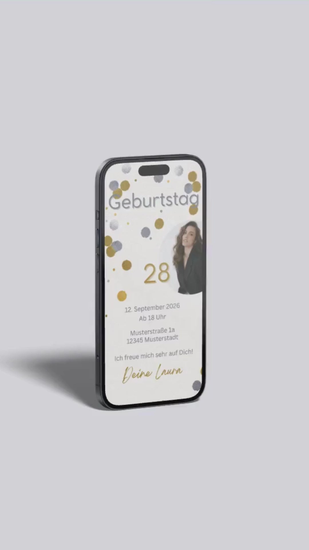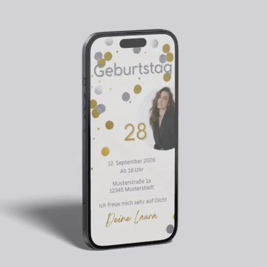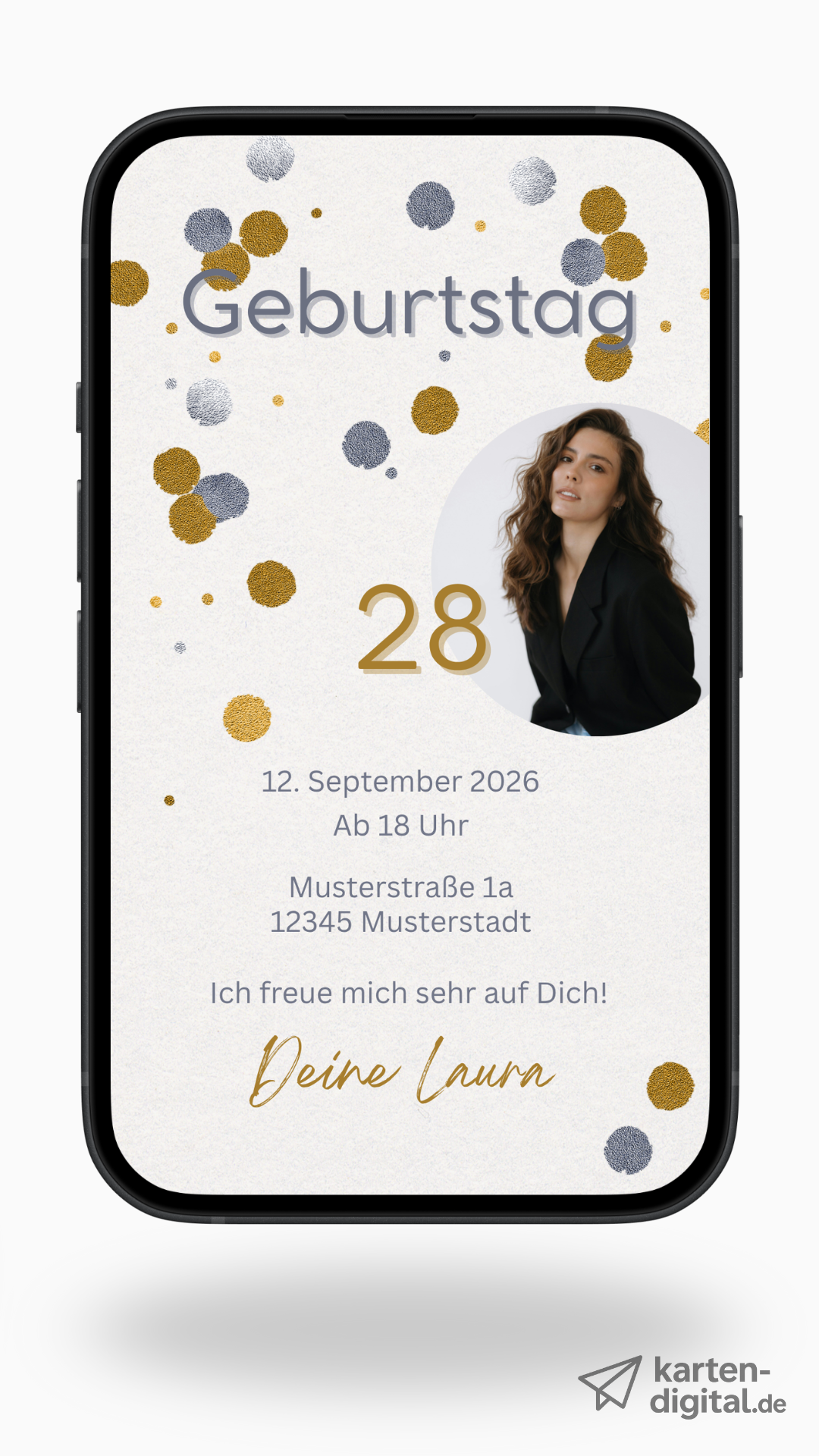 Diese digitale Einladung zum Geburtstag kombiniert ein schlichtes, modernes Design mit stilvollen Akzenten in Gold und Silber. Der lockere Konfetti-Look trifft auf eine klare Typografie und ein persönliches Foto – ideal, um Deine Gäste stilvoll und herzlich einzuladen.