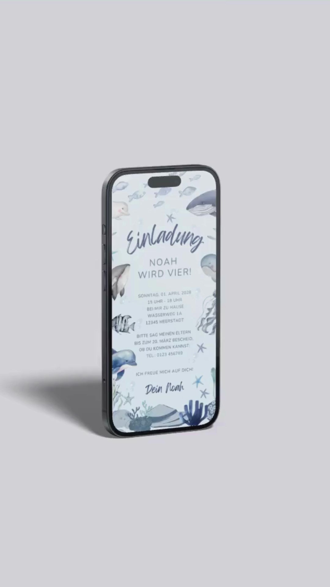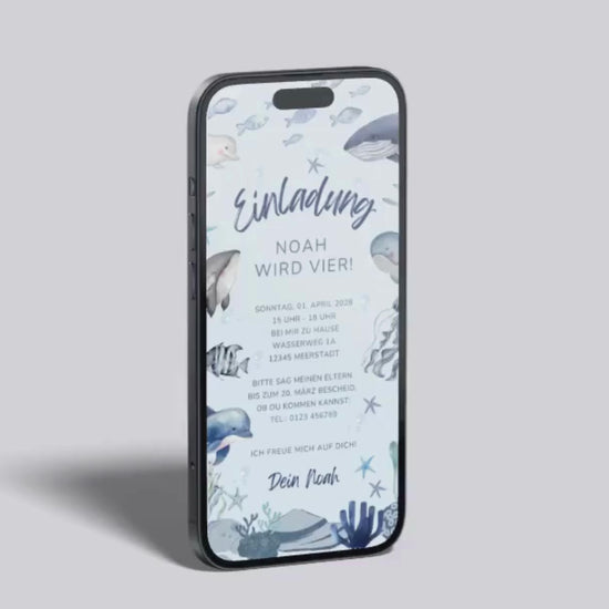 Diese digitale Geburtstagseinladung bringt die Magie der Unterwasserwelt direkt aufs Smartphone. Sanfte Blautöne, verspielte Meeresbewohner und liebevolle Aquarell-Illustrationen schaffen eine fröhliche, kindgerechte Atmosphäre – perfekt für kleine Entdecker*innen und alle, die das Meer lieben.