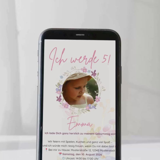 Perfekt für kleine Naturfreundinnen, die ihren Ehrentag stilvoll ankündigen möchten. Der Blumenkranz verleiht der Karte einen märchenhaften Charme und macht sie zum Hingucker auf jedem Smartphone.