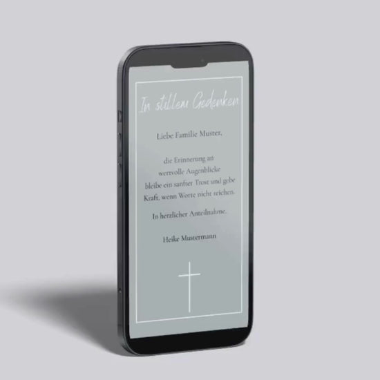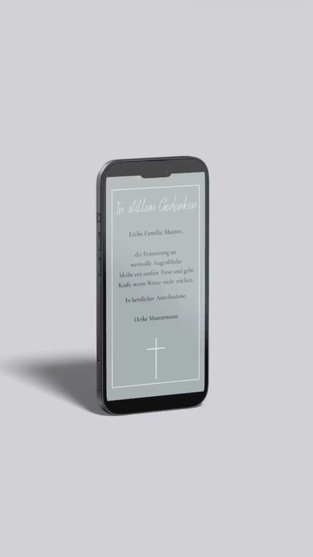 Diese digitale Kondolenzkarte verbindet ein sanftes Grau mit einer klaren, zeitlosen Gestaltung. Der feine Rahmen und das schlichte weiße Kreuz am unteren Rand verleihen der Karte eine ruhige, würdige Ausstrahlung – modern, zurückhaltend und dennoch tröstlich.