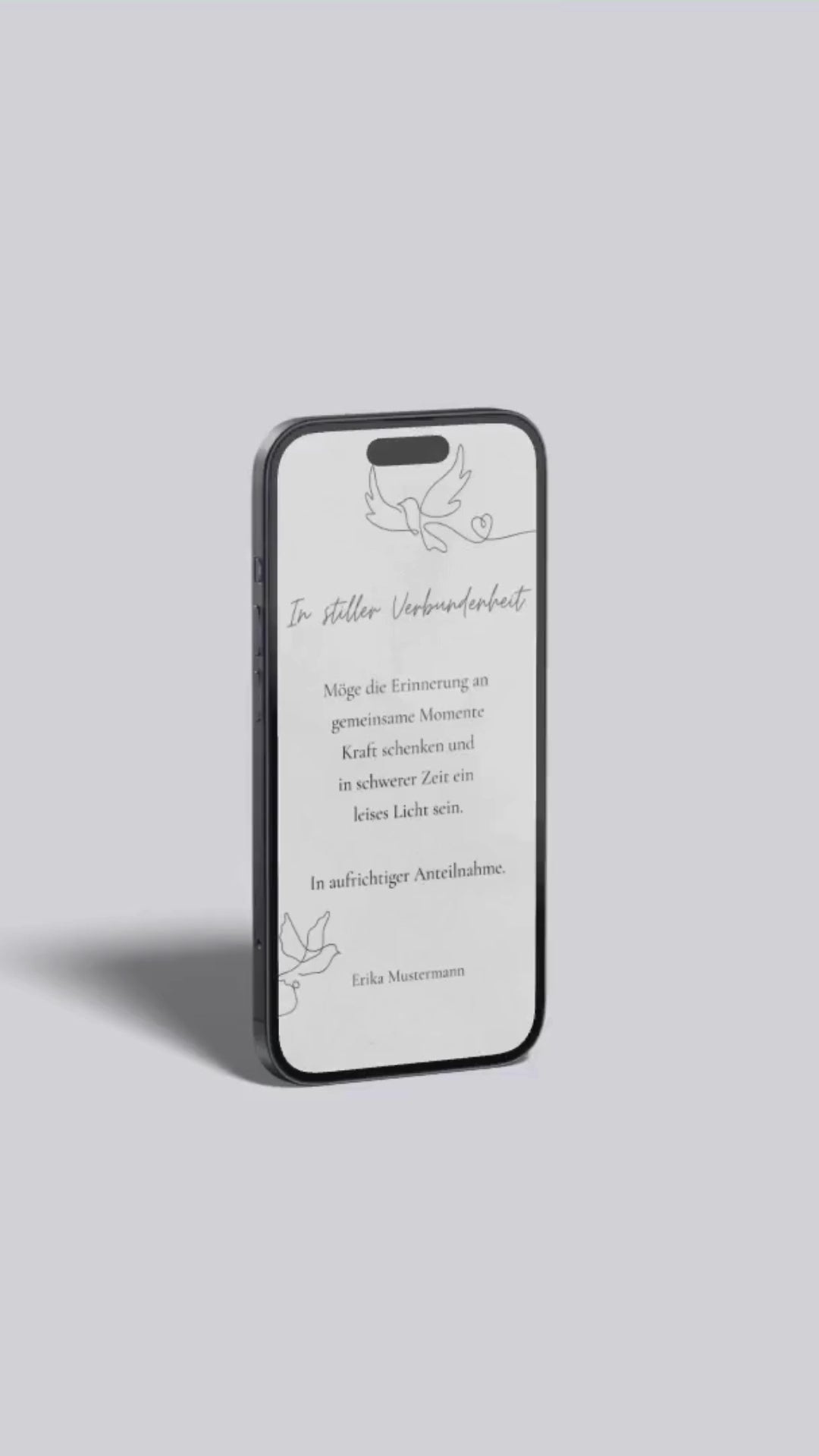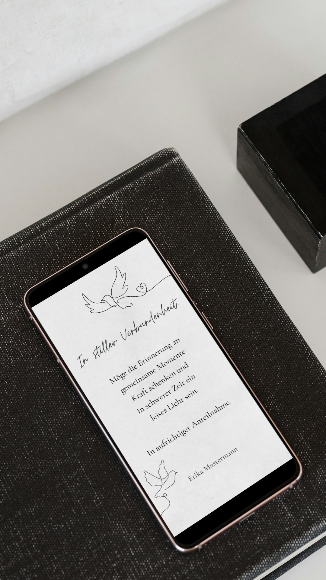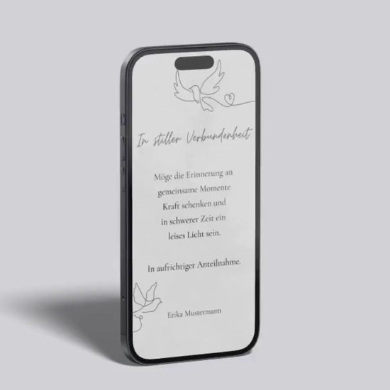 Diese digitale Kondolenzkarte verbindet stille Anteilnahme mit einem sanften, modernen Design. Die feine Linienzeichnung einer Taube steht symbolisch für Frieden, Hoffnung und Verbundenheit. In Kombination mit dem klaren Weißraum entsteht eine ruhige, zeitlose Gestaltung, die Trost spendet, ohne aufdringlich zu wirken.