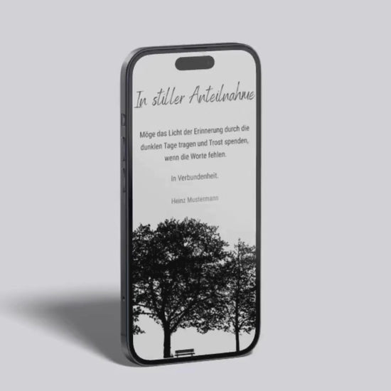Diese digitale Kondolenzkarte setzt auf ein ausdrucksstarkes Schwarzweiß-Design: Die Silhouette eines Baumes mit einer stillen Parkbank darunter schafft ein Bild von Ruhe, Erinnerung und innerem Einkehren. Das schlichte Grau des Hintergrunds und die zurückhaltende Typografie lassen viel Raum für Gefühle und verleihen der Karte eine zeitlose, würdevolle Wirkung.