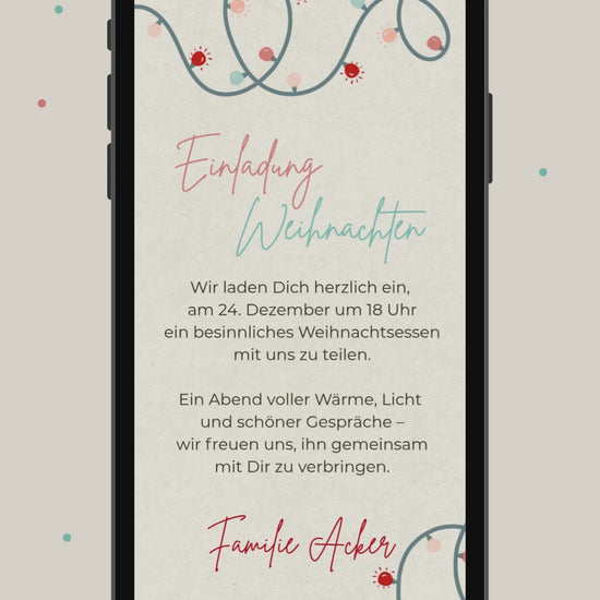 Diese liebevoll gestaltete Video-Karte bringt den Zauber von Weihnachten direkt aufs Handy! Die sanft animierte Lichterkette sorgt für eine warme, einladende Atmosphäre und macht deine Einladung zu etwas ganz Besonderem. Ideal, um Familie oder Freund:innen stilvoll und modern zum gemeinsamen Weihnachtsessen einzuladen.