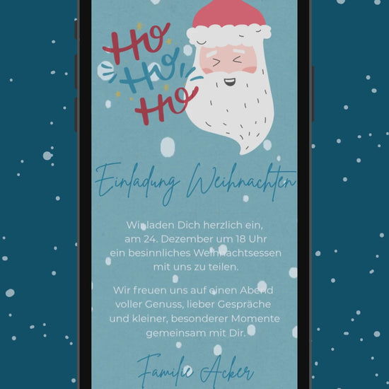 Diese digitale Video-Einladung zu Weihnachten verbindet ein fröhliches, modernes Design mit liebevollen Animationen: Sanft fallender Schnee lässt die winterliche Szene lebendig wirken, während der verspielte „Ho Ho Ho“-Schriftzug und die Illustration des Weihnachtsmannes eine warme, herzliche Stimmung erzeugen.