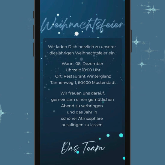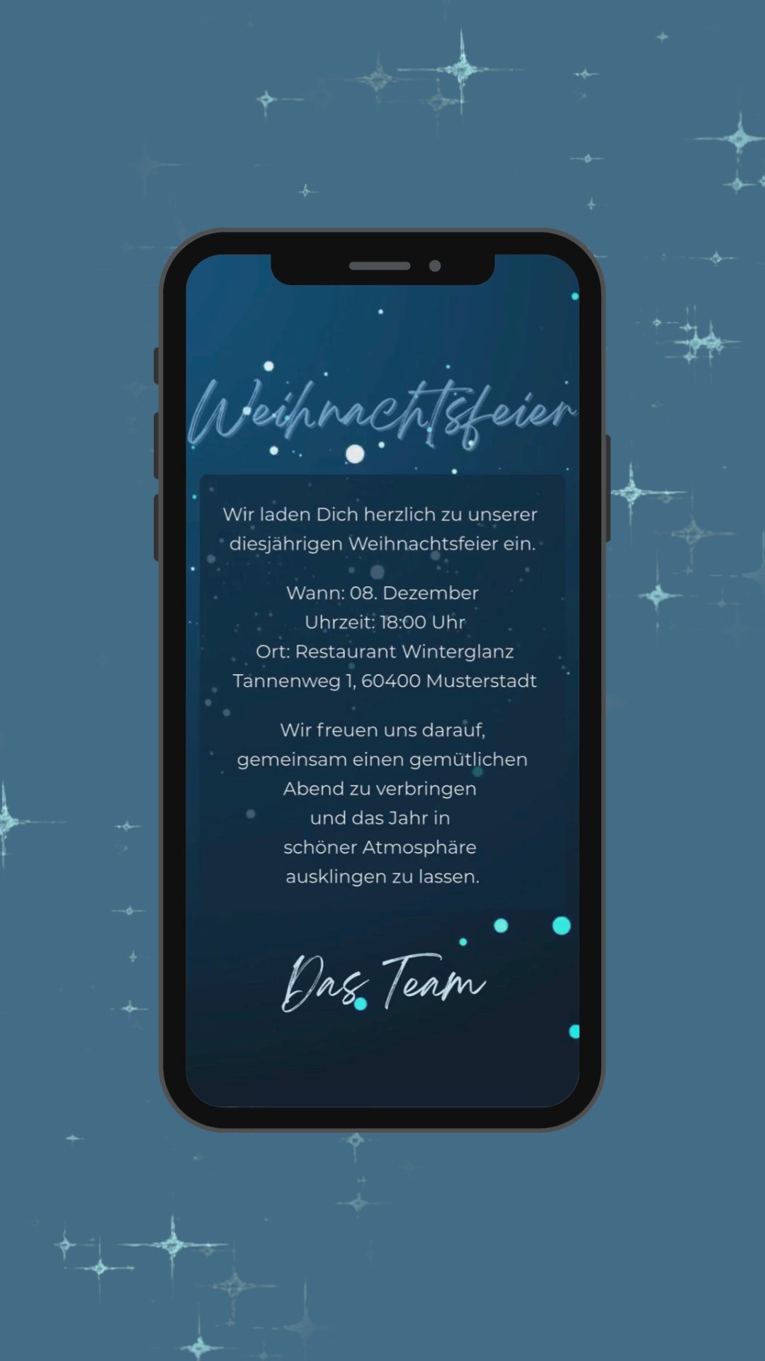 Der tiefblaue Hintergrund unterstreicht die winterliche Stimmung, während leuchtende Partikel und feine Glanzeffekte dem Video eine hochwertige, fast magische Atmosphäre schenken. Die Bewegung der Lichtpunkte sorgt für einen dezenten Wow-Effekt und macht die Einladung zu etwas ganz Besonderem.