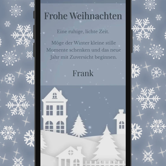 Diese digitale Weihnachts-Videoeinladung fängt die stille Magie der Winterzeit in einem modernen, eleganten Design ein. Sanft fallende Schneeflocken legen sich über eine ruhige, winterliche Häuserlandschaft und lassen eine Atmosphäre voller Wärme, Ruhe und Besinnlichkeit entstehen.