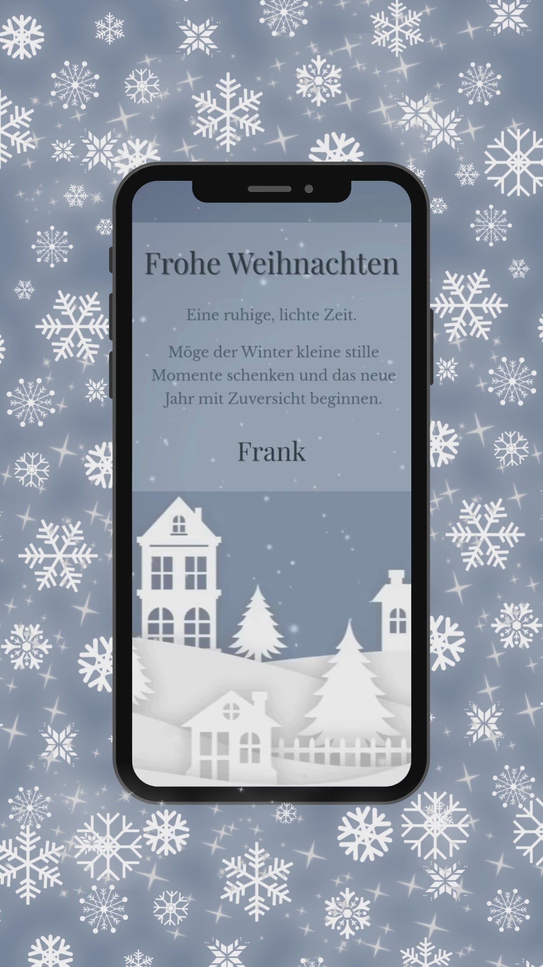 Ideal für persönliche Weihnachtsgrüße, festliche Einladungen im kleinen oder größeren Kreis oder liebevolle digitale Botschaften. Das Video lässt sich individuell anpassen und auf moderne, stilvolle Weise teilen – ruhig, hochwertig und voller winterlicher Stimmung.