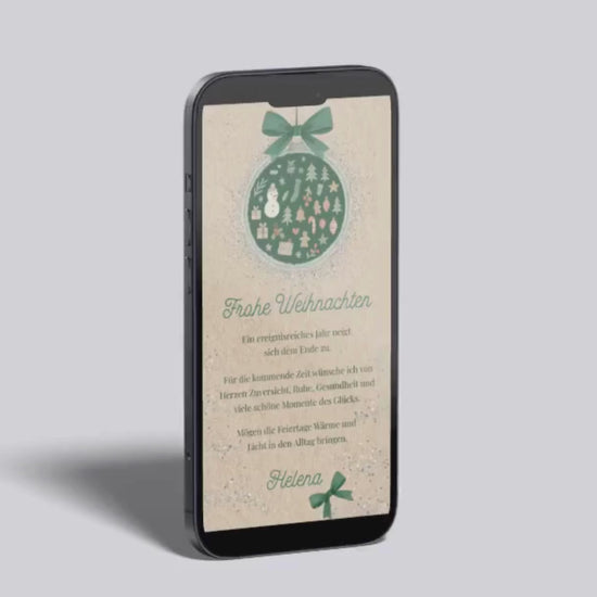 Diese digitale Weihnachtskarte verbindet natürliche Wärme mit einem ruhigen, festlichen Design. Im Mittelpunkt steht ein liebevoll gestaltetes Ornament in tiefem Grün, umrahmt von zartem Silberglanz und gekrönt von einer weichen, aquarellartigen Schleife.