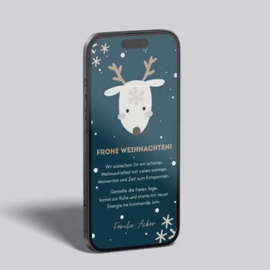 Diese digitale Weihnachtskarte bringt mit dem verspielten Rentiermotiv und dem tiefblauen Hintergrund sofort festliche Stimmung auf jedes Smartphone. Die niedliche Illustration mit Schneeflocken, warmen Farbakzenten und liebevollen Details verleiht der Karte einen charmanten und winterlichen Charakter – perfekt für alle, die auf humorvolle und moderne Weise Frohe Weihnachten wünschen möchten.