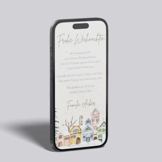 Diese digitale Weihnachtskarte bringt sofort winterliche Stimmung ins Herz. Das Design mit den liebevoll illustrierten Häuschen im Schnee und dem eleganten Schriftbild ist stilvoll und gleichzeitig voller Wärme. Perfekt, um persönliche Weihnachtsgrüße digital zu verschicken – ob an Familie, Freund:innen oder Kolleg:innen.