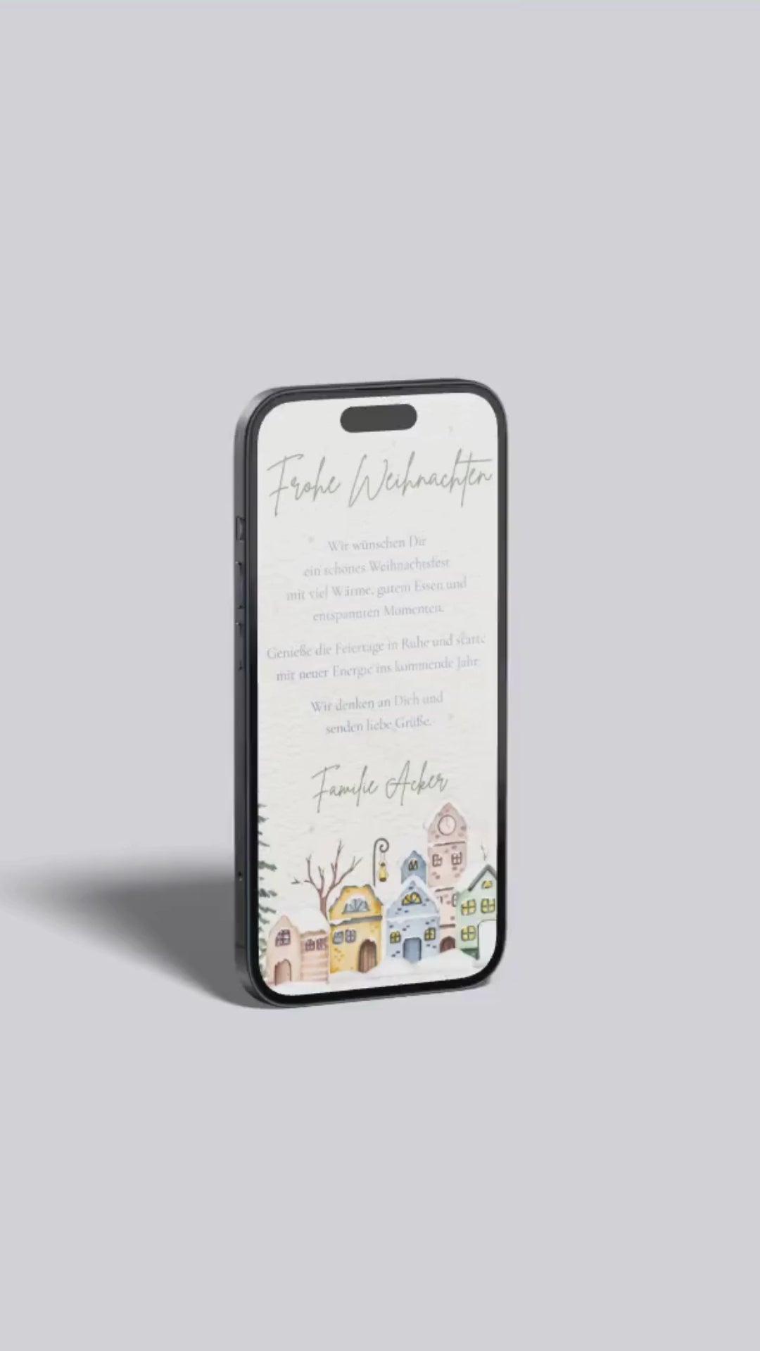 Die festliche Botschaft auf der Karte ist bereits vorformuliert und drückt auf charmante Weise Nähe, Dankbarkeit und gute Wünsche aus – kann aber bei Bedarf auch ganz individuell angepasst werden. Die Karte wird als digitales Bild geliefert und eignet sich ideal für den Versand per WhatsApp, E-Mail oder anderen Messengern.