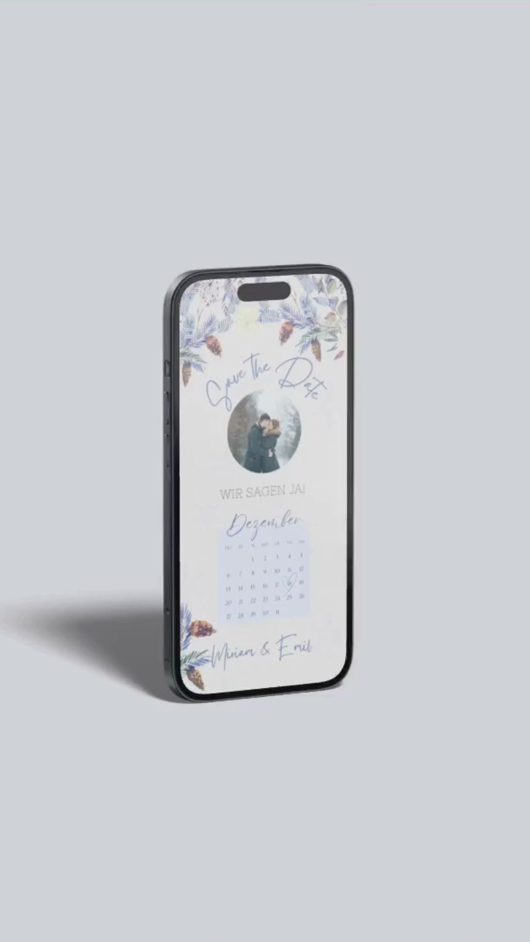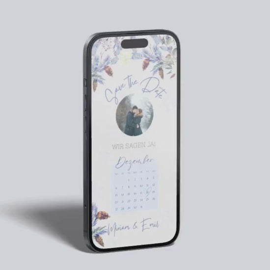 Diese stilvolle digitale Save-the-Date-Karte ist wie gemacht für eine romantische Winterhochzeit. Das frostige Design mit Tannenzweigen, Zapfen und zarten Blüten sorgt für eine festliche Atmosphäre und kündigt euren großen Tag auf charmante Weise an. Der integrierte Kalender mit hervorgehobenem Datum macht sofort klar: Dieser Tag ist etwas ganz Besonderes.