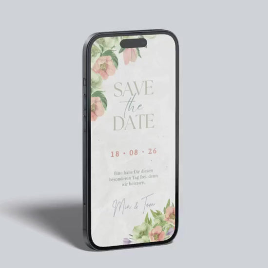 Diese digitale Save-the-Date Karte überzeugt mit einem zarten Aquarelldesign aus pastellfarbenen Blüten und sanftem Grünton – perfekt für alle, die eine romantische und zugleich moderne Hochzeitsankündigung suchen. Die Kombination aus floraler Leichtigkeit und klarer Typografie macht diese Karte zum stilvollen Vorboten eures großen Tages.