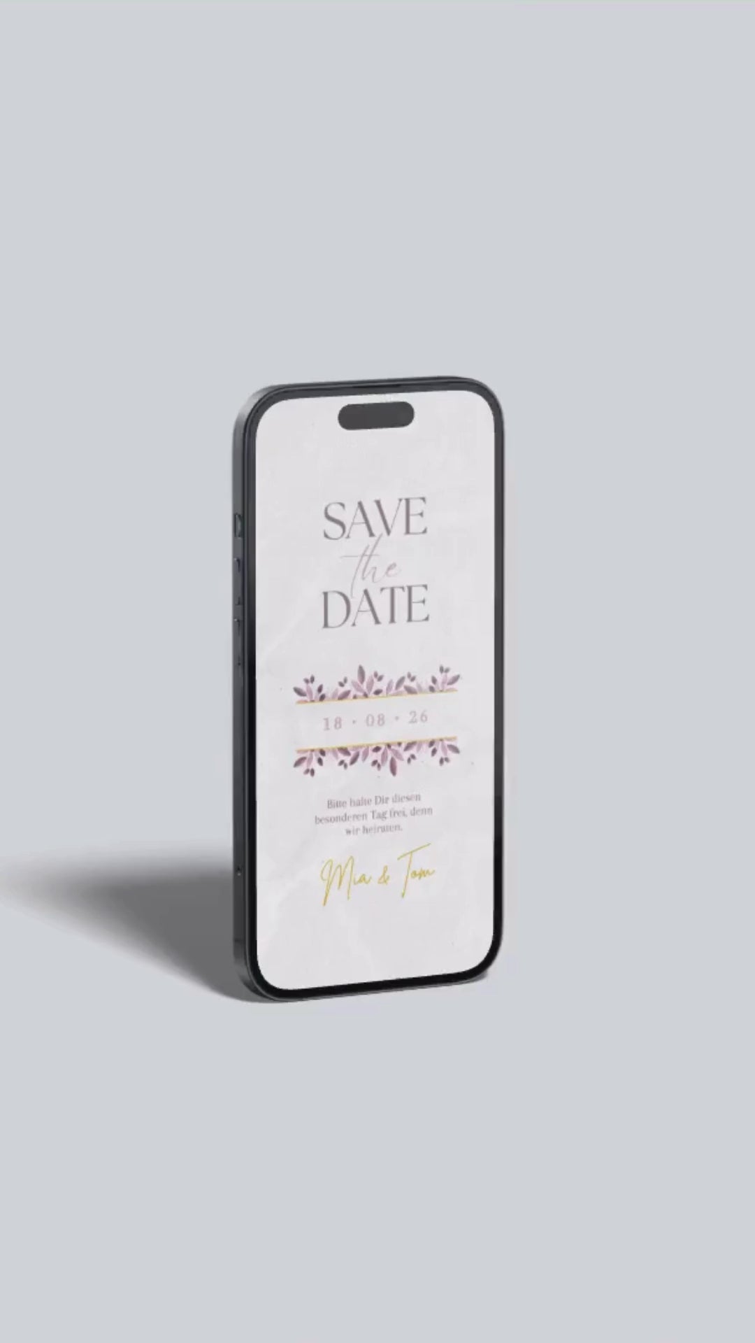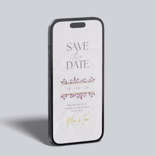 Diese digitale Save-the-Date Karte verbindet schlichte Eleganz mit einer feinen Portion Farbe. Die floralen Ranken in zartem Violett und goldene Akzente verleihen dem Design eine moderne und zugleich festliche Ausstrahlung – perfekt für Paare, die ihren Hochzeitstermin mit Stil ankündigen möchten.