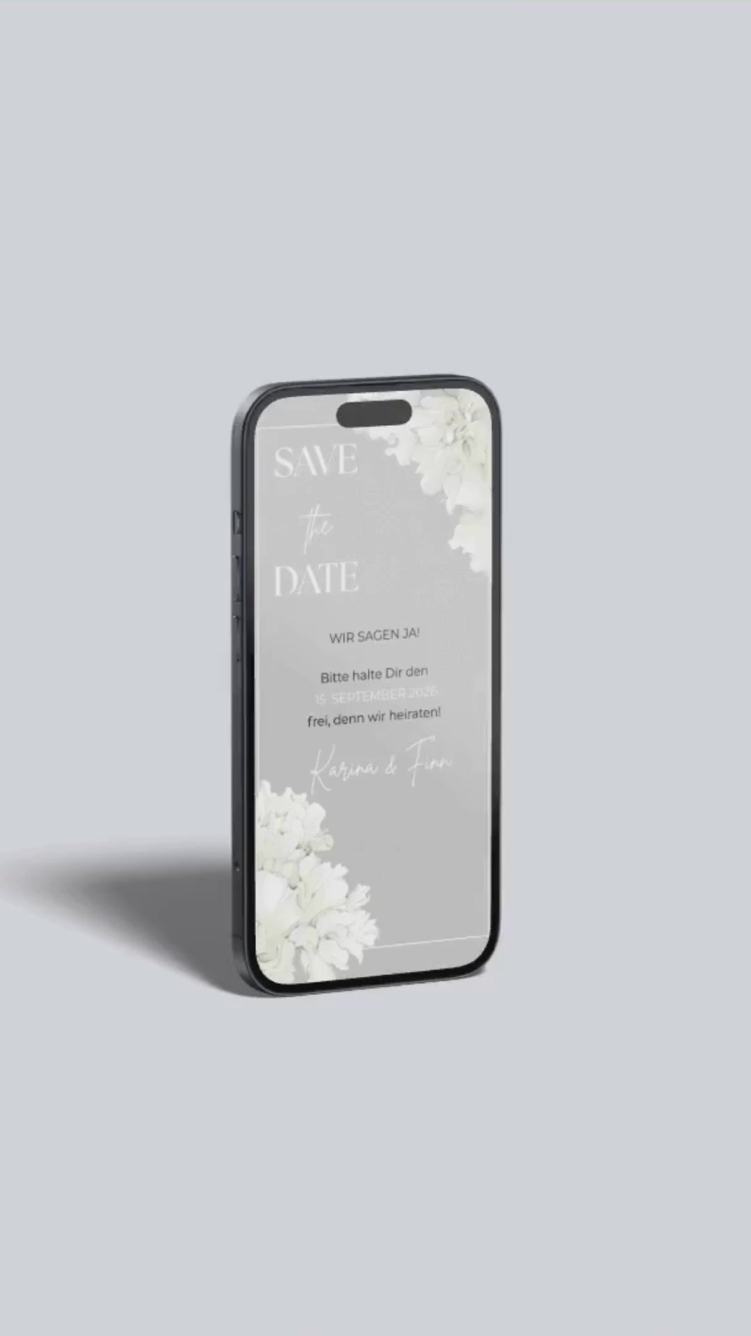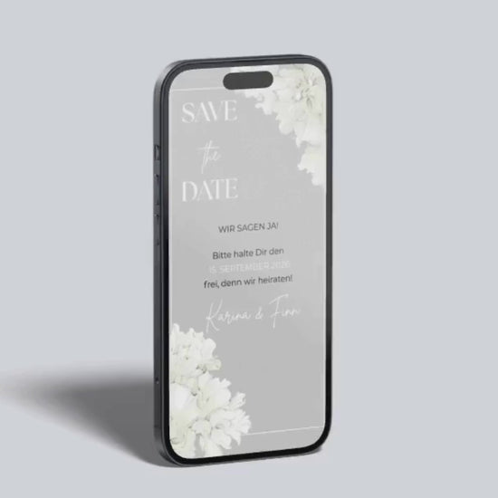 Diese digitale Save the Date Karte besticht durch ihr modernes, minimalistisches Design in sanften Grautönen und feinen weißen Blumenakzenten. Die klare Gestaltung schafft eine elegante und zeitlose Atmosphäre, die eure Einladung besonders macht. Versendet eure Save the Date Karte digital, unkompliziert und nachhaltig, und informiert eure Gäste frühzeitig über euren großen Tag. Perfekt für Paare, die Wert auf stilvolle Schlichtheit und Persönlichkeit legen.