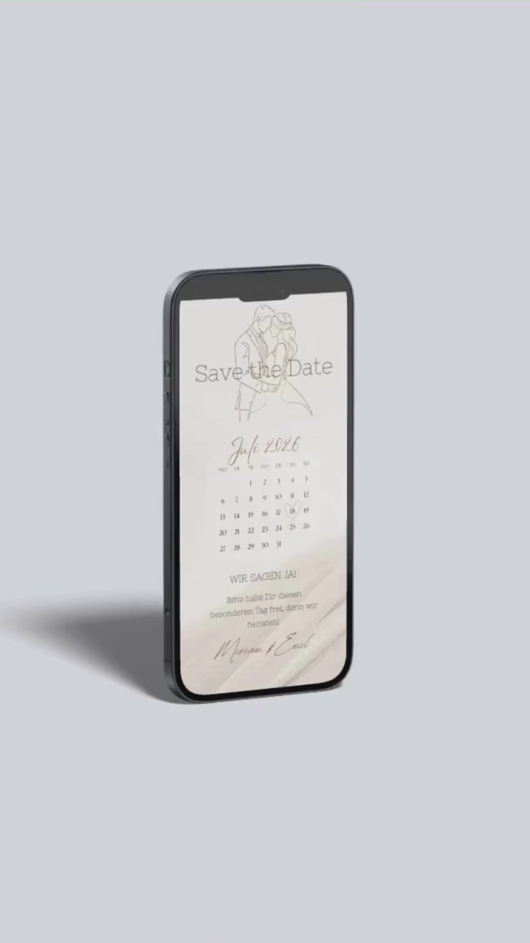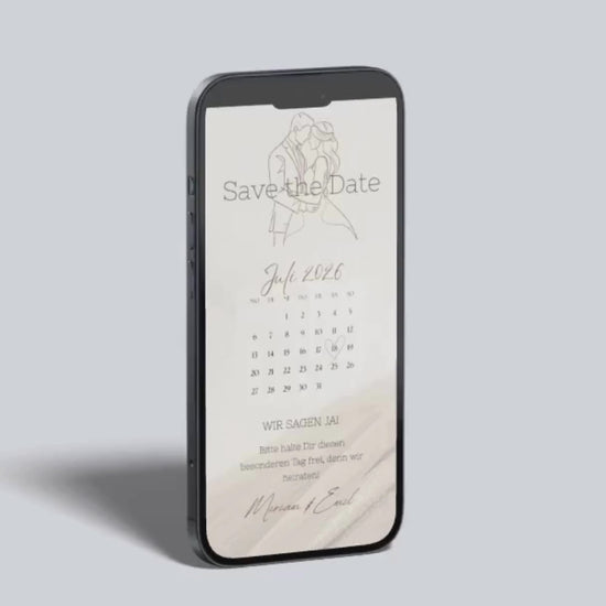 Diese digitale Save the Date Karte verbindet ein zeitgemäßes Design mit einer zarten Linienzeichnung eines Brautpaares und einem dezenten Stoffhintergrund. Die klare Kalenderübersicht hebt euren besonderen Tag hervor und schafft eine warme, elegante Atmosphäre. Versendet eure Einladung digital und unkompliziert – nachhaltig und mit viel Persönlichkeit. Ideal für Paare, die eine moderne und stilvolle Einladung mit einem Hauch künstlerischer Eleganz suchen.