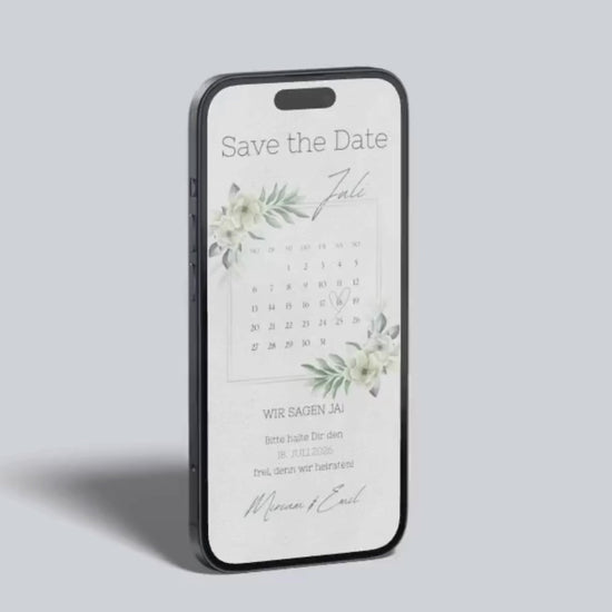 Diese digitale Save the Date Karte besticht durch ein zartes und natürliches Design mit weißen Blumen und grünen Blättern, die eure Einladung stilvoll rahmen. Die klare Kalenderansicht hebt euren besonderen Tag liebevoll hervor und schafft eine ruhige, elegante Atmosphäre. Versendet eure Einladung digital, unkompliziert und nachhaltig – perfekt für Paare, die Wert auf zeitlose Eleganz und eine persönliche Note legen.