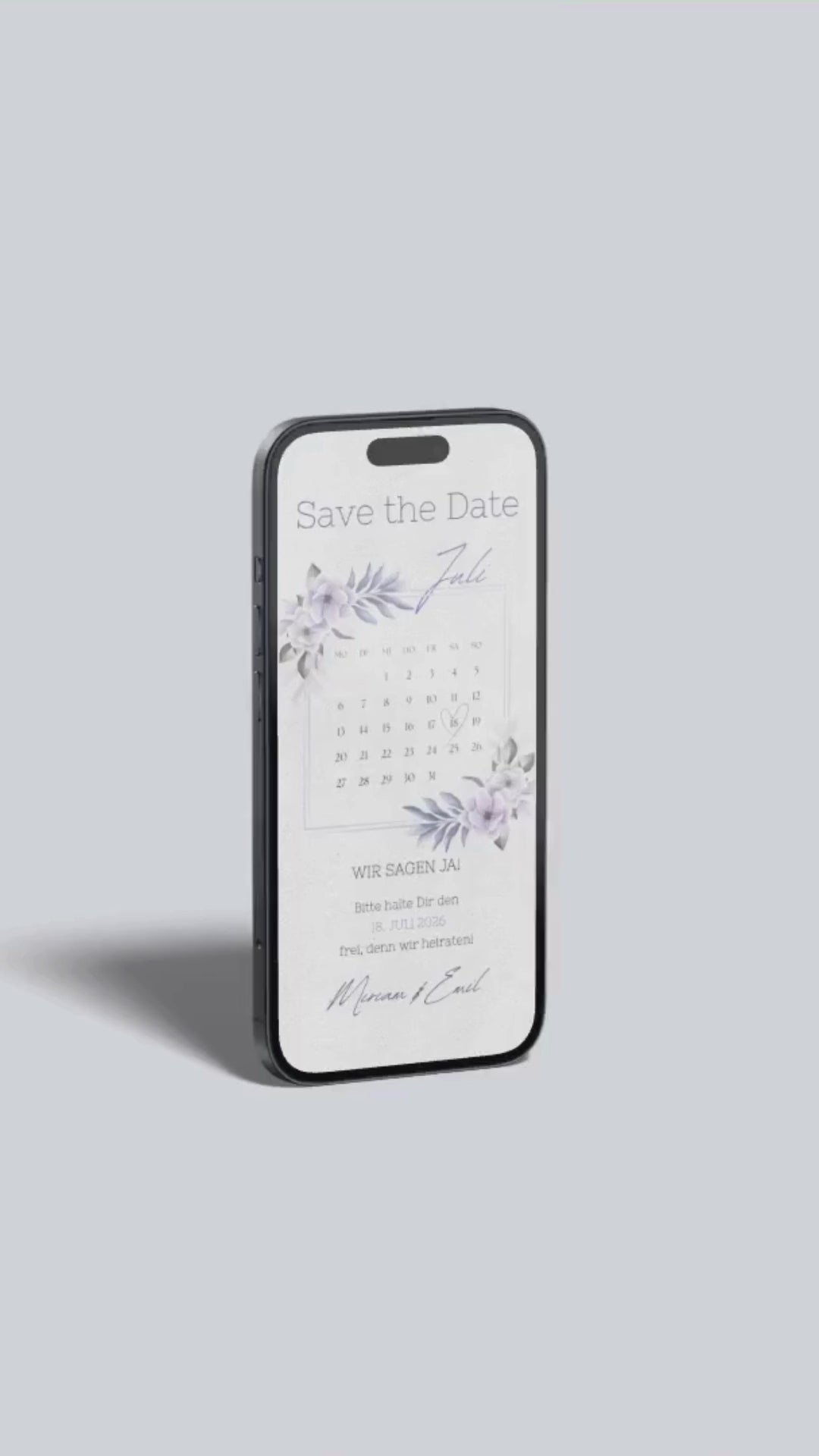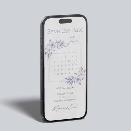 Diese digitale Save the Date Karte besticht durch ein zartes Design mit lilafarbenen Blumen und grünen Blättern, die eure Einladung auf elegante und natürliche Weise umrahmen. Die klare Kalenderansicht hebt euren besonderen Tag liebevoll hervor und schafft eine ruhige, stilvolle Atmosphäre. Versendet eure Einladung digital, unkompliziert und nachhaltig – ideal für Paare, die eine harmonische Verbindung von Eleganz und Natürlichkeit schätzen.