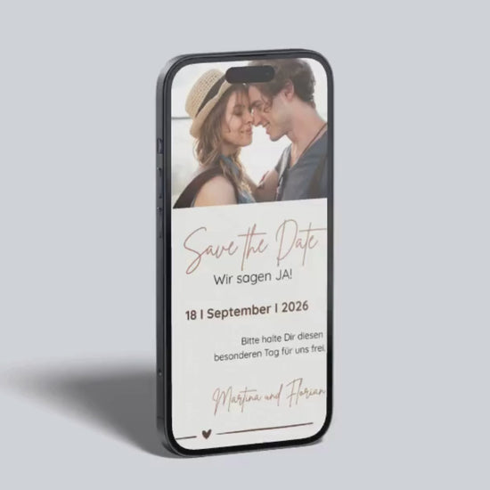 Eure Hochzeit ist etwas ganz Besonderes – genau wie diese digitale Save the Date Karte. Das moderne und zugleich zeitlose Design überzeugt durch klare Linien und warme Farbtöne, die eure Vorfreude auf den großen Tag stilvoll unterstreichen. So informiert ihr eure Gäste frühzeitig und herzlich, ohne viel Aufwand. Nachhaltig, unkompliziert und persönlich – perfekt für Paare, die Wert auf Eleganz und Einfachheit legen. Bereitet euren Liebsten eine schöne Überraschung und sichert euch gemeinsam einen Termin, der für immer in Erinnerung bleibt.