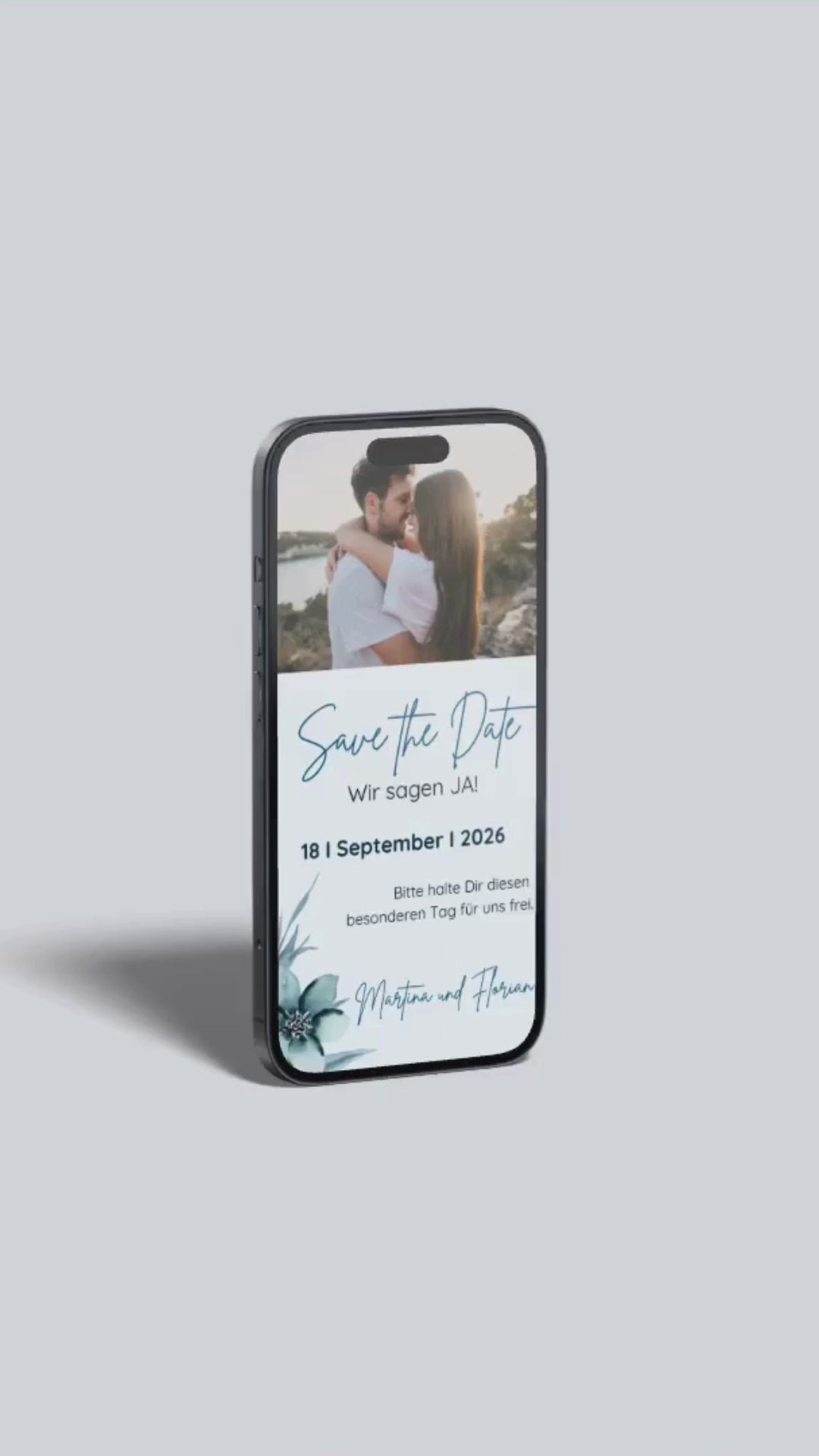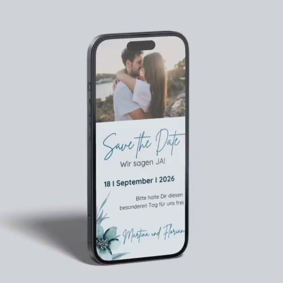 Diese digitale Save the Date Karte verbindet modernes Design mit einer natürlichen Farbwelt und sorgt so für einen stilvollen Auftritt eurer Einladung. Das sanfte Blau und florale Elemente schaffen eine ruhige, einladende Atmosphäre, die perfekt zu einer zeitgemäßen Hochzeitseinladung passt. Informiert eure Gäste frühzeitig und herzlich über euren besonderen Tag – einfach digital, nachhaltig und mit viel Liebe zum Detail. So könnt ihr eure Vorfreude teilen und euren Termin auf elegante Weise festhalten.