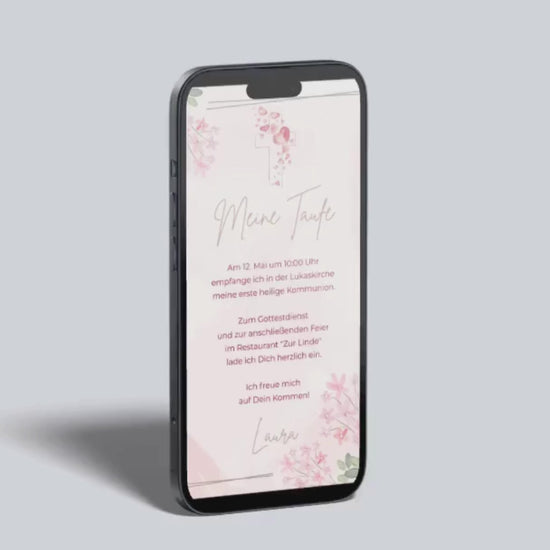 Diese wunderschöne digitale Taufeinladung besticht durch ein elegantes Design in zarten Rosétönen, florale Aquarelle und ein liebevoll gestaltetes Kreuz aus Herzen und Blüten. Perfekt für eine feierliche Tauffeier mit familiärem Charakter – modern, stilvoll und emotional.
