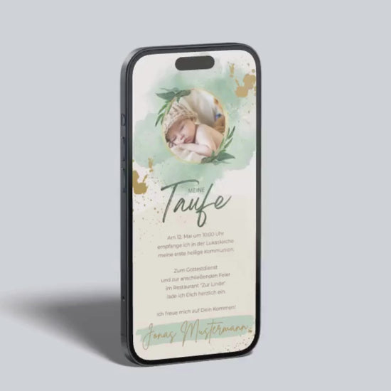 Diese digitale Einladung zur Taufe vereint natürliche Eleganz mit modernen Design-Elementen. Der sanfte grüne Aquarellhintergrund, goldene Akzente und ein liebevoll eingerahmtes Foto machen die Karte zu einem ganz persönlichen Hingucker für den besonderen Tag.