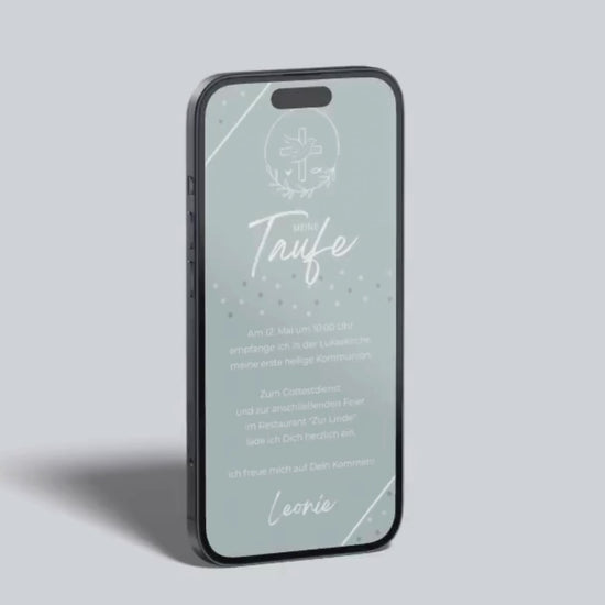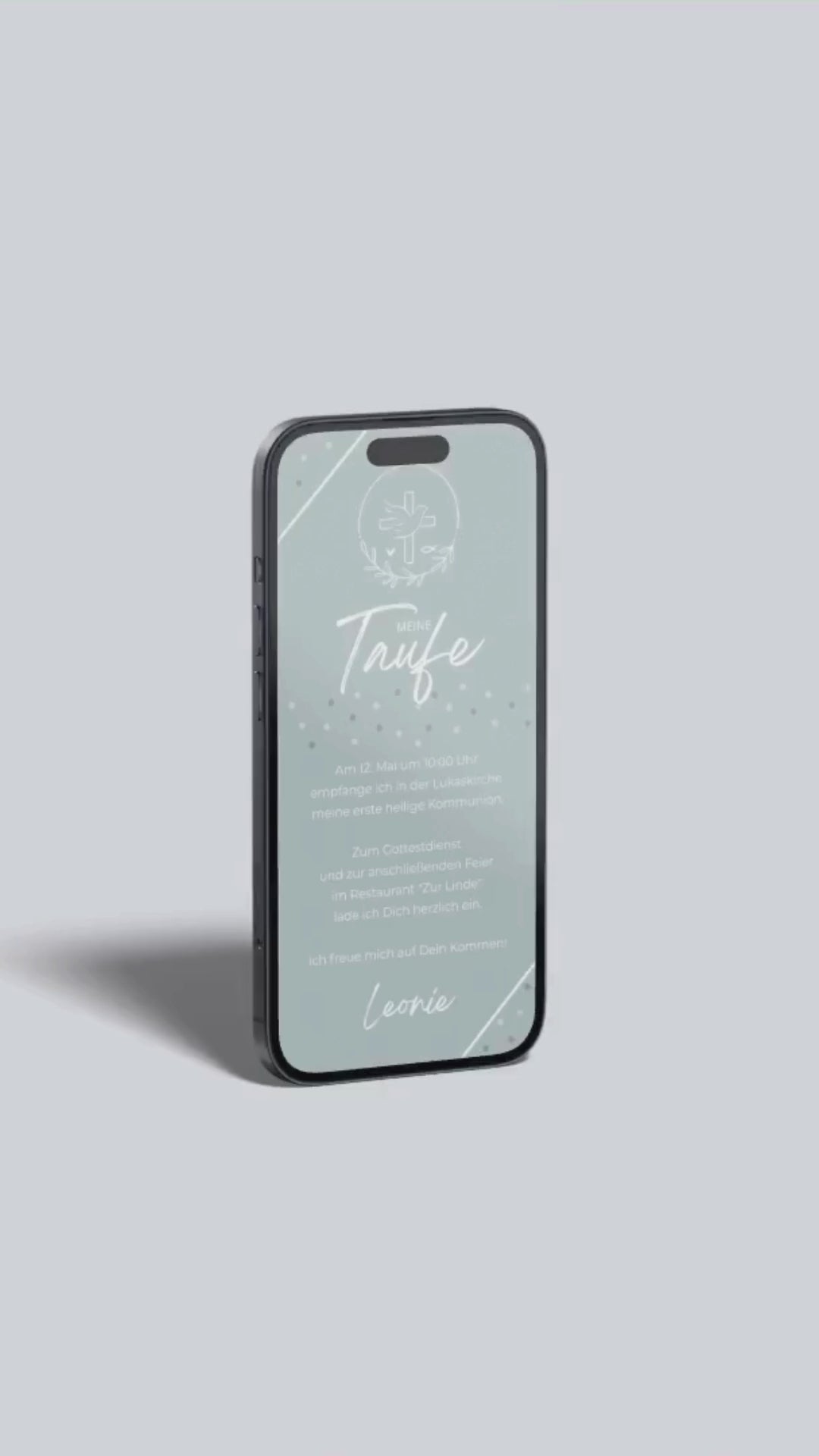 Diese digitale Einladung zur Taufe überzeugt durch ein reduziertes, stilvolles Design in gedecktem Grau-Blau. Im Mittelpunkt steht ein feines christliches Symbol mit Kreuz, Taube und Zweigen – ein schönes Zeichen für Segen, Frieden und Neubeginn.