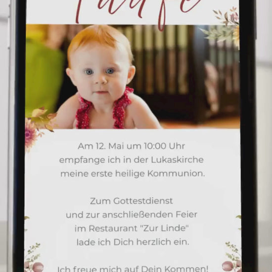 Diese digitale Einladung zur Taufe verbindet warme Herbstfarben mit zarten Aquarellblumen und einem persönlichen Foto des Täuflings. Das liebevoll gestaltete Design schafft eine feierliche, herzliche Atmosphäre – ideal für eine ganz besondere Tauffeier.