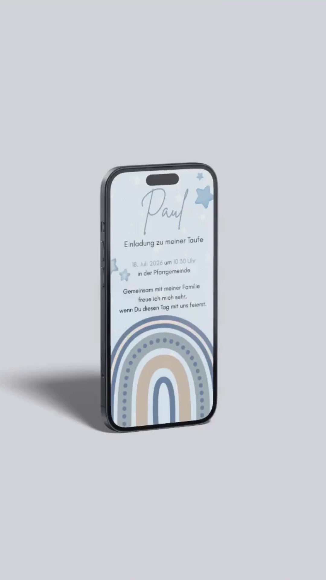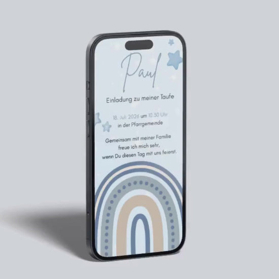 Ein besonderer Tag verdient einen liebevollen Rahmen – und diese digitale Taufeinladung verbindet genau das. Der sanfte Blauton, der Regenbogen in harmonischen Nuancen und die zarten Sterne schaffen eine festliche, himmlische Atmosphäre.