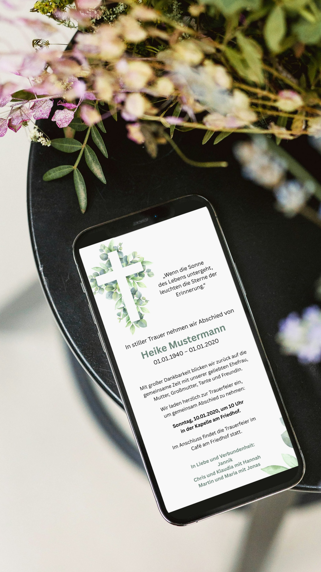 Die Karte kann individuell angepasst und unkompliziert per WhatsApp, E-Mail oder SMS verschickt werden – ein moderner Weg, sich gemeinsam zu verabschieden, mit Wärme und Herz.