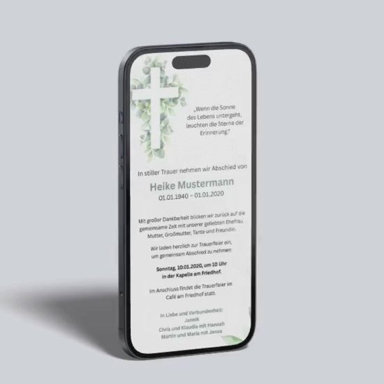 Digitale Trauerkarte mit Kreuz und Eukalyptus – modern, natürlich und tröstlich gestalten