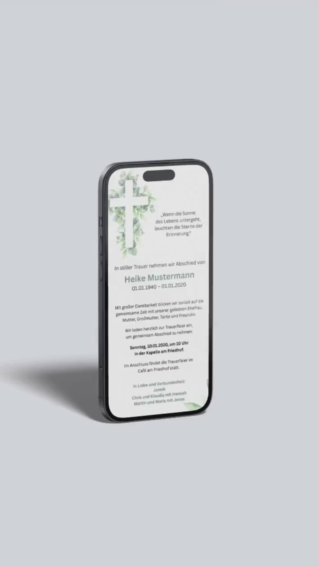 Diese digitale Trauerkarte verbindet klassische Symbolik mit einem modernen, sanften Design. Das weiße Kreuz, liebevoll umrahmt von Eukalyptuszweigen, steht für Frieden, Abschied und die Kraft des Erinnerns – passend ergänzt durch das Zitat: „Wenn die Sonne des Lebens untergeht, leuchten die Sterne der Erinnerung.“