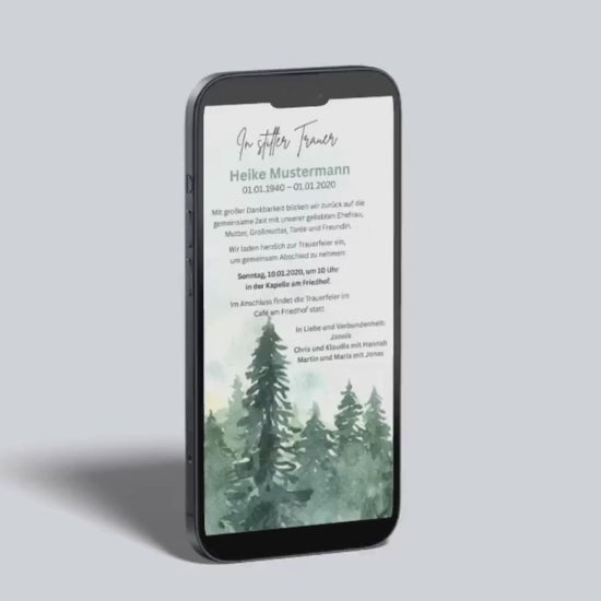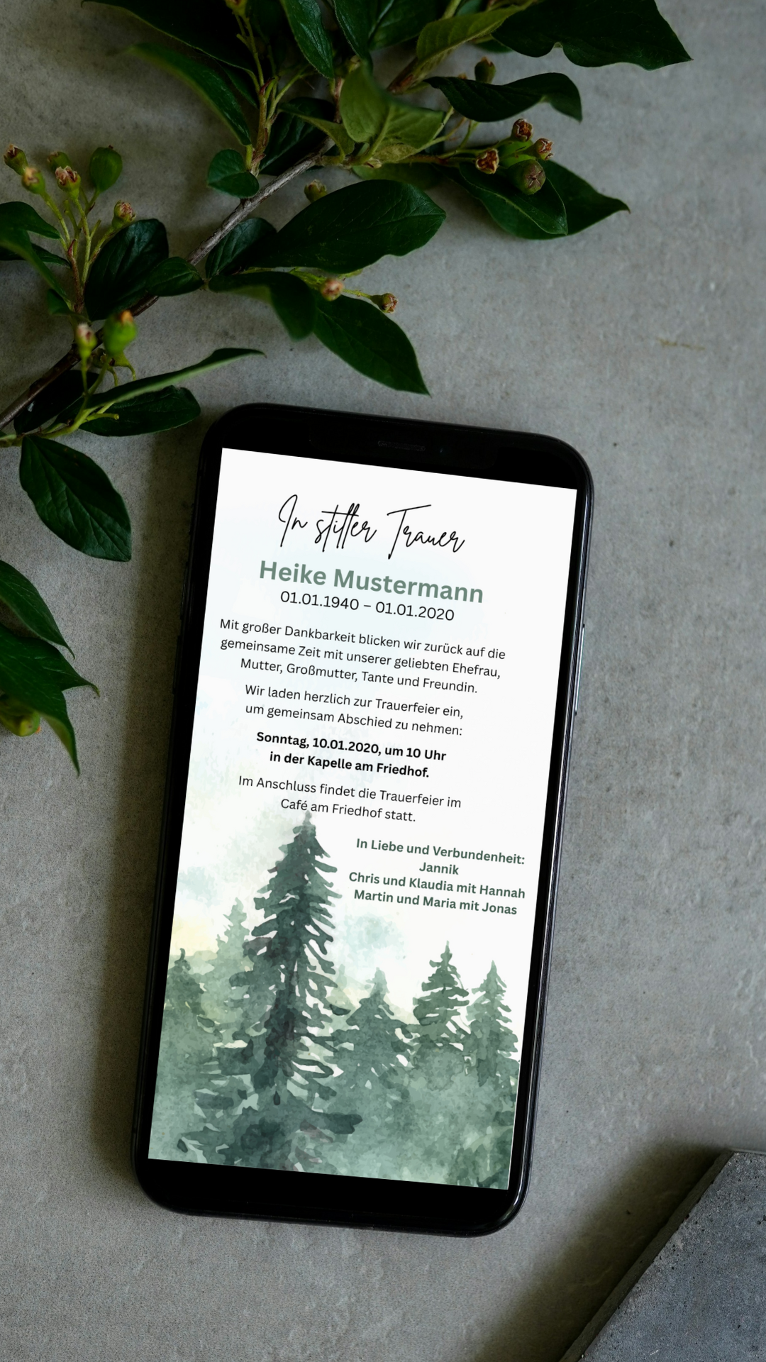 Die sanfte Gestaltung im Aquarell-Stil vermittelt Ruhe und Trost, während alle wichtigen Informationen klar und würdevoll übermittelt werden. Ideal, um schnell und unkompliziert per Handy, WhatsApp oder E-Mail zu teilen – besonders, wenn nicht alle Angehörigen in der Nähe sind.