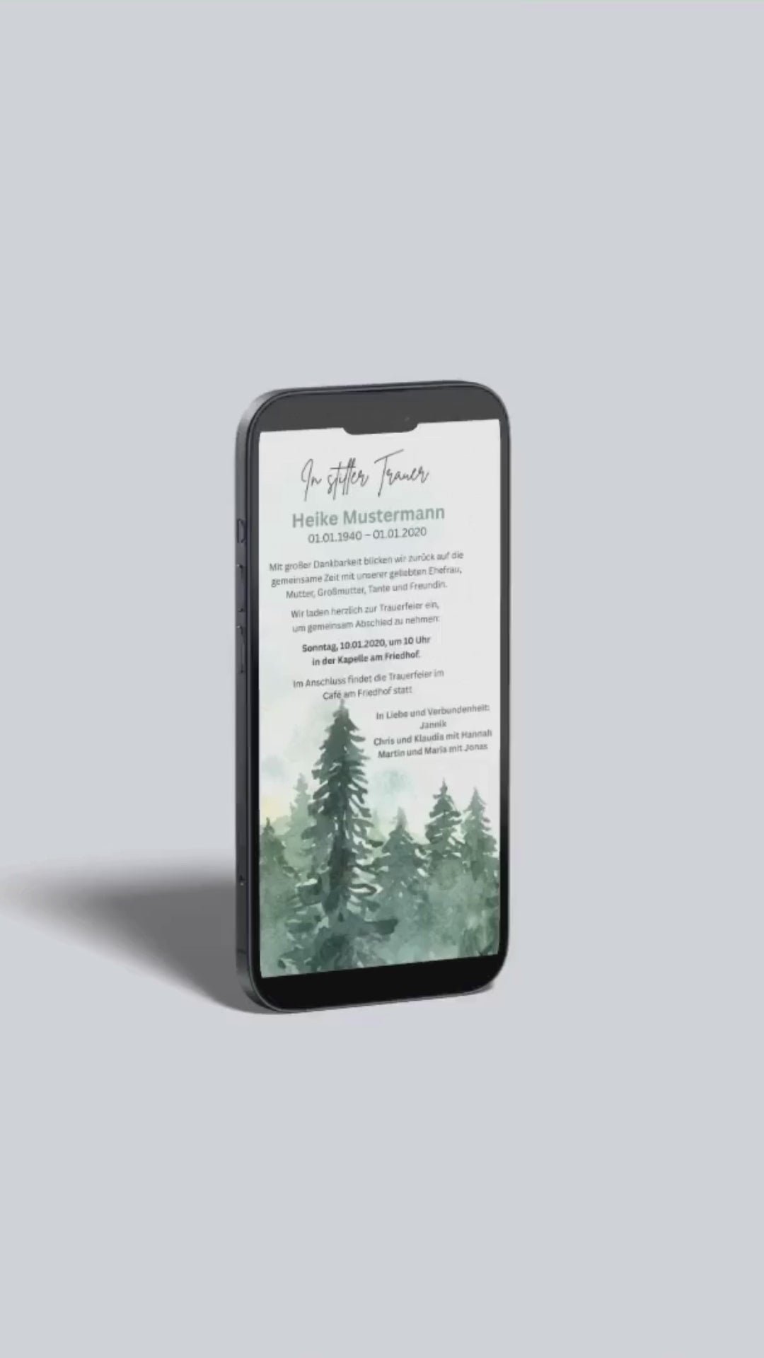 Ein geliebter Mensch ist gegangen – und es ist schwer, die richtigen Worte zu finden. Diese digitale Trauerkarte hilft dabei, Familie und Freunde liebevoll und respektvoll zu informieren: über den Verlust, den Ort der Beisetzung und die gemeinsame Abschiednahme.