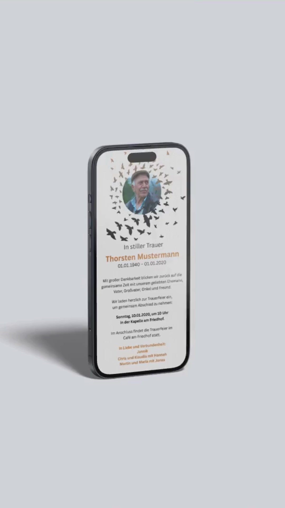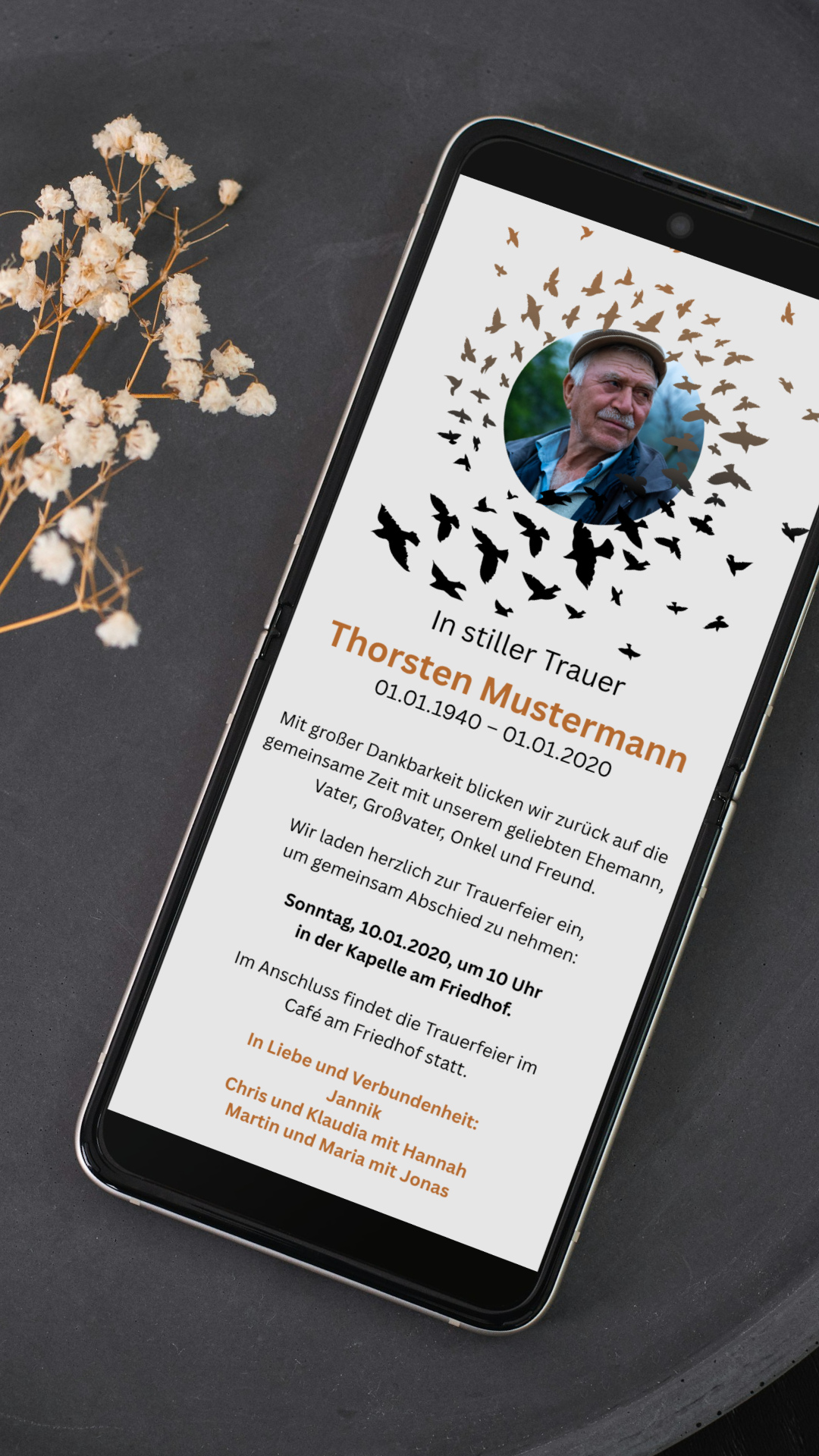 Die Karte lässt sich einfach individuell anpassen und direkt per Smartphone, WhatsApp oder E-Mail versenden – ein einfühlsamer Weg, nahestehende Menschen rechtzeitig und respektvoll zu erreichen.