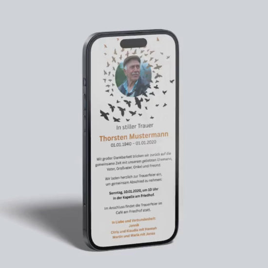 Diese digitale Trauerkarte verbindet persönliche Erinnerung mit einer stilvollen Einladung zur Beisetzung. Durch das integrierte Foto entsteht ein besonders nahbarer Moment – ein letzter Gruß, der nicht nur informiert, sondern auch berührt.